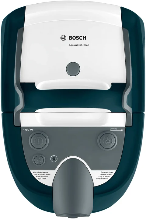 reinigung, 2,5 lt Staubbehälter, 1700 W, EPA 10 Primärfilter, 9 m Radius, Flüssigkeitsaufnahmedüsen, Parkettbürste, Wassertank: 5 l, türkis-weiß-grau