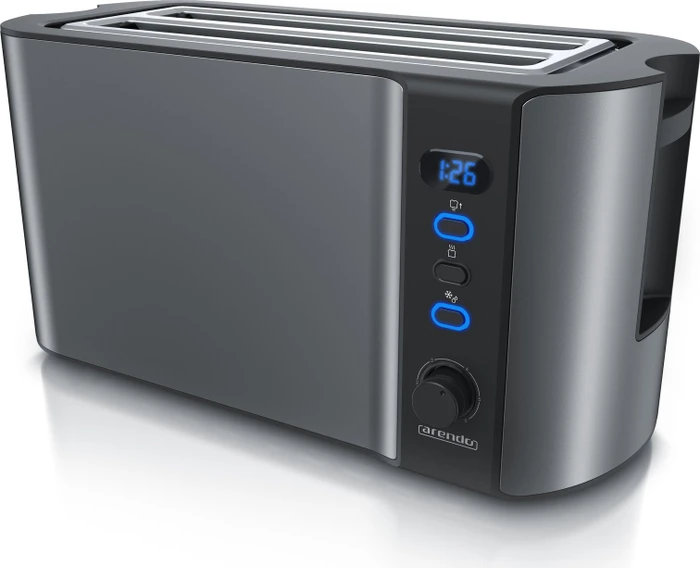 n, Langschlitztoaster, Langschlitz, Edelstahl, 1500W, Display mit Restzeitanzeige, Brötchenaufsatz, Defrost Funktion, Wärmeisolierendes Gehäuse, Grau